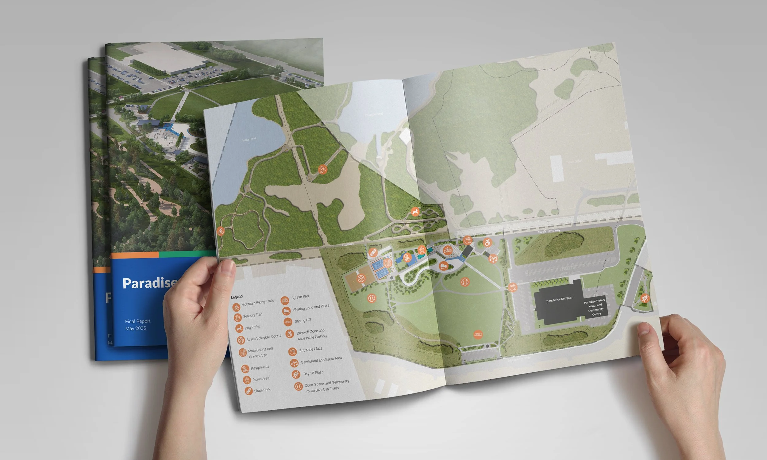 Building on this foundation, we crafted a clear vision and guiding principles for the park, translating community ideas into a cohesive master plan complete with concept designs, visual renderings, accessibility strategies, and a phased implementation framework with cost estimates. The result is a forward-looking roadmap that positions Paradise Park as a vibrant, inclusive, and year-round destination - celebrating its unique history while creating new opportunities for recreation, connection, and community life.