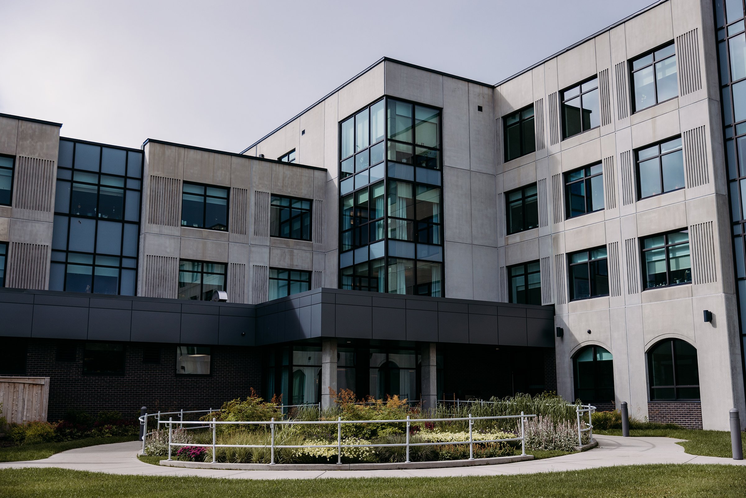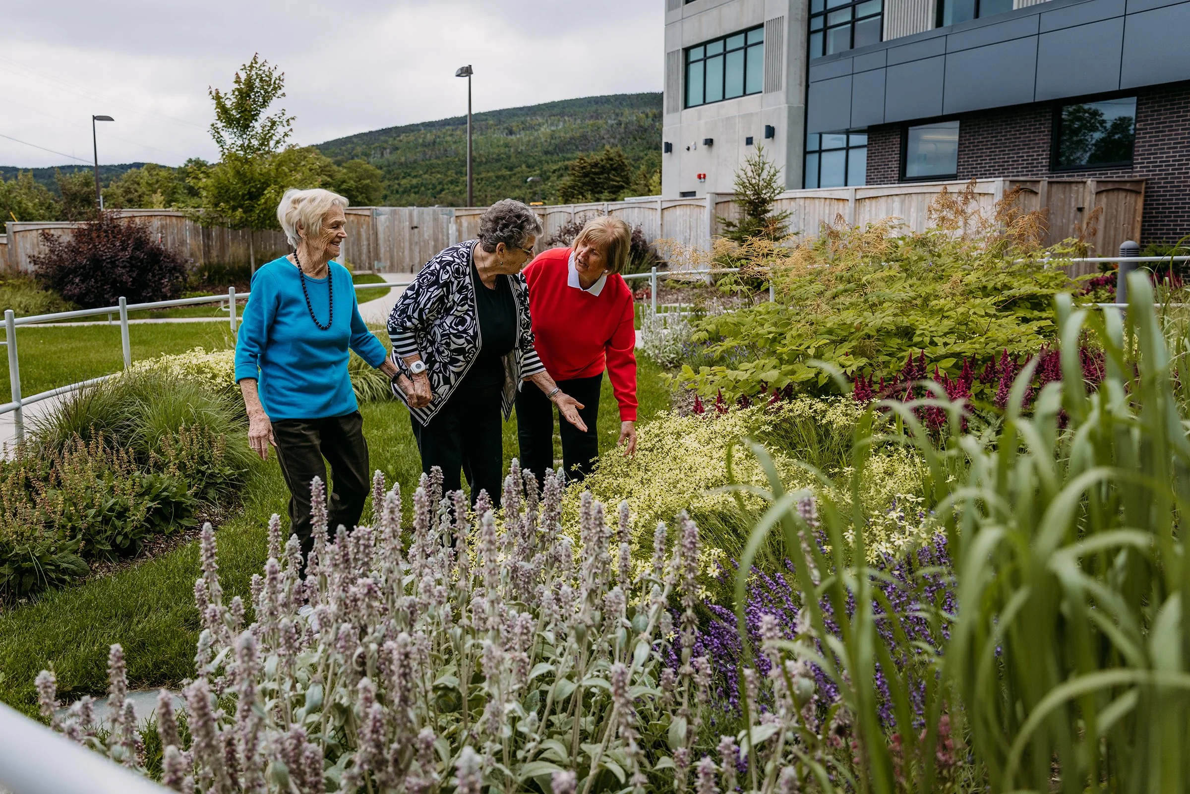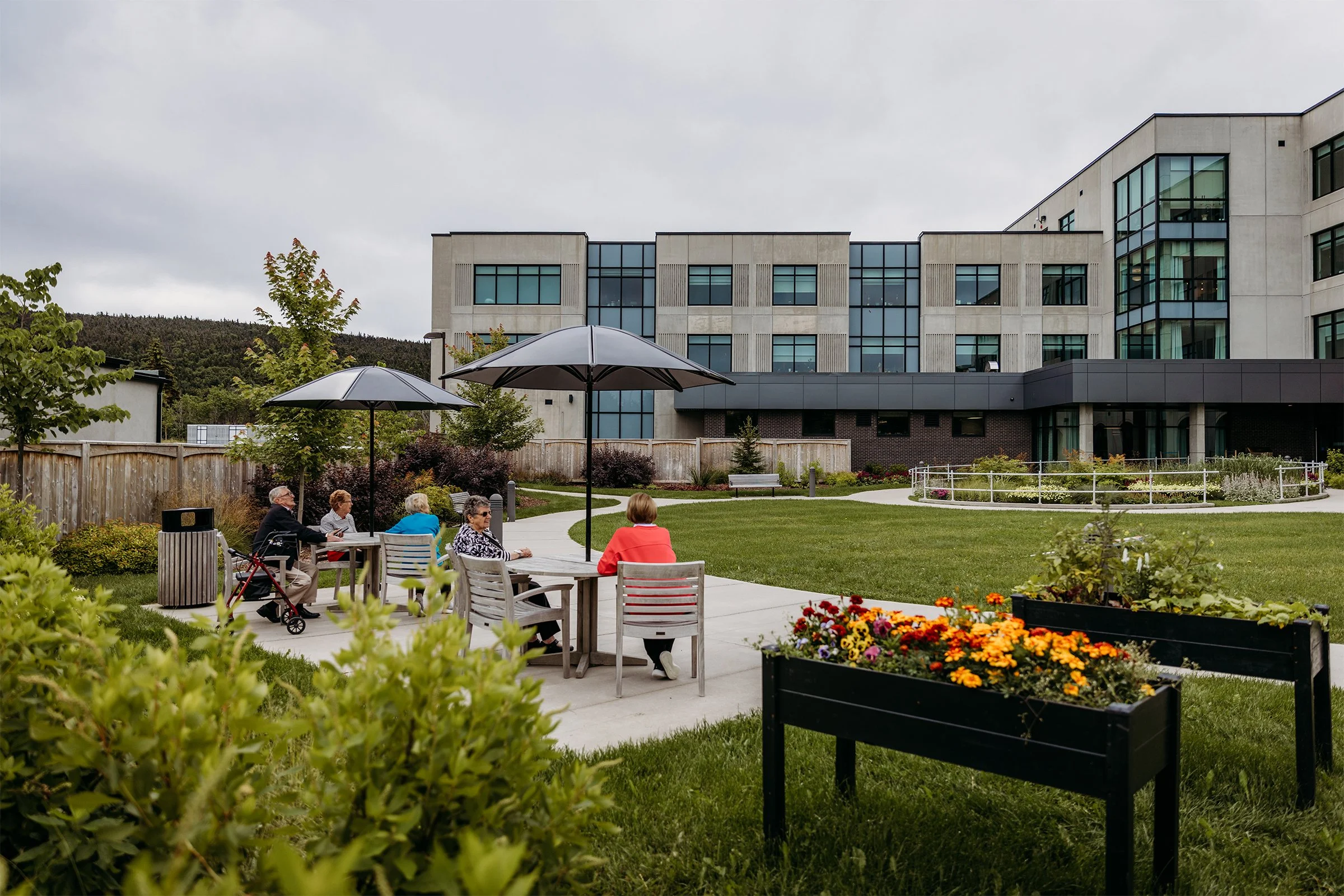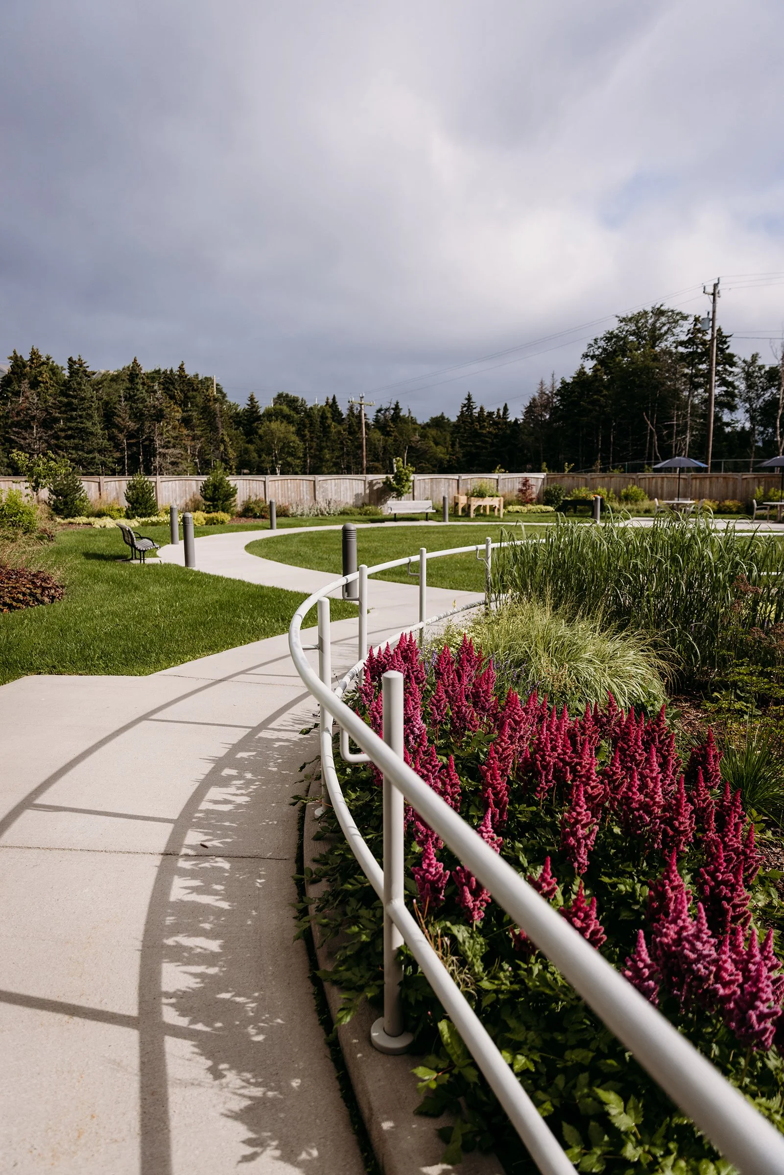 Mills & Wright was part of the multidisciplinary project team for this state-of-the-art assisted and independent living facility. The design provides a warm, welcoming feeling more akin to a home than an institution. The parklike setting and variety of comfortable outdoor spaces convey a message of care, health, and well-being for residents, staff and visitors and capitalize on existing site features such as mature stands of vegetation, comfortable southern exposure, and views of the scenic Waterford Valley. Landscape amenities provide accessible and inclusive opportunities for physical and social interaction, and are designed to appeal to a variety of ages, abilities, and levels of care. This includes an entry garden, woodland trail, a pond and fountain, as well as a therapeutic strolling garden. The lush gardens are designed to reflect a traditional Newfoundland garden, complete with nostalgic plant and landscape materials, to provide visual interest and act as a memory trigger for residents, invoking positive memories of their former homes.