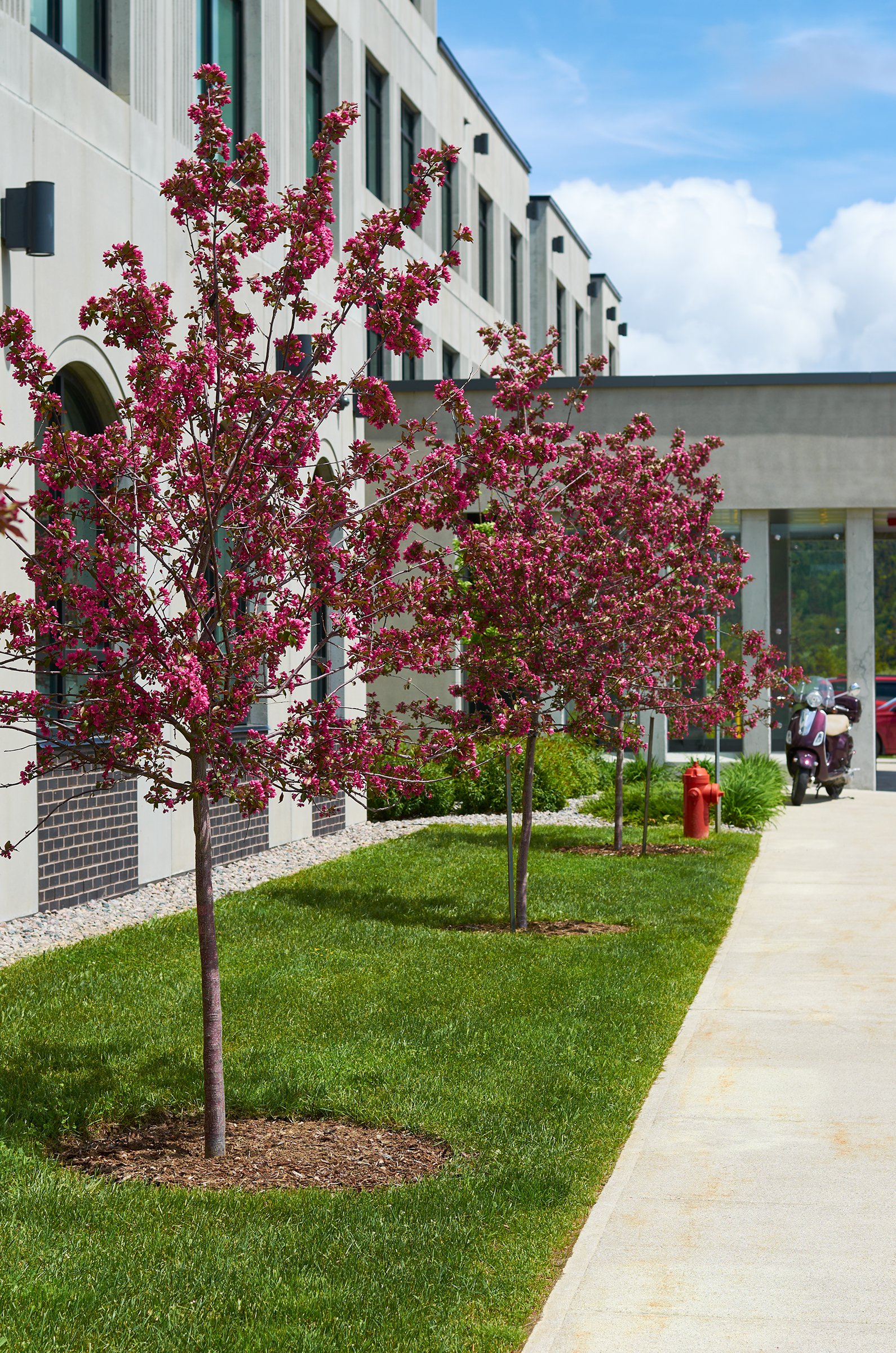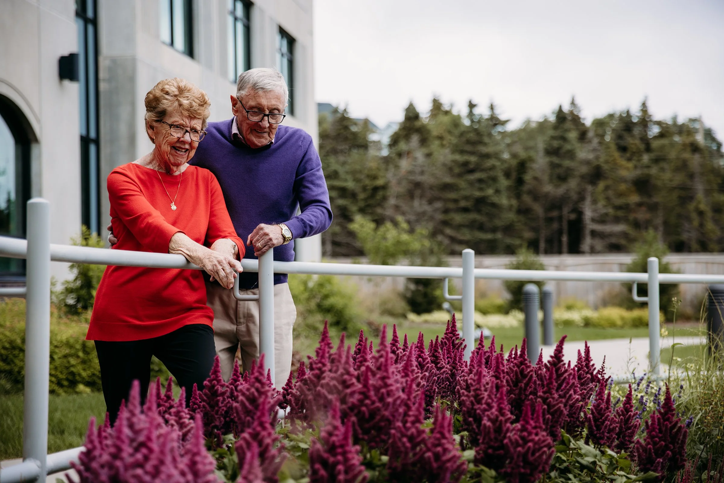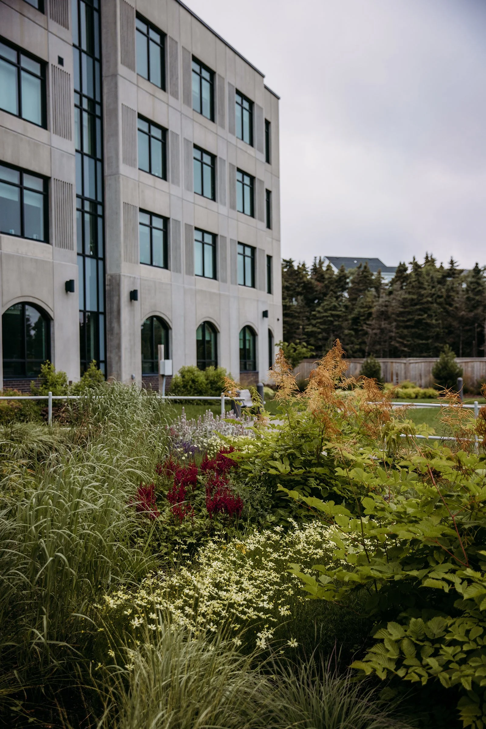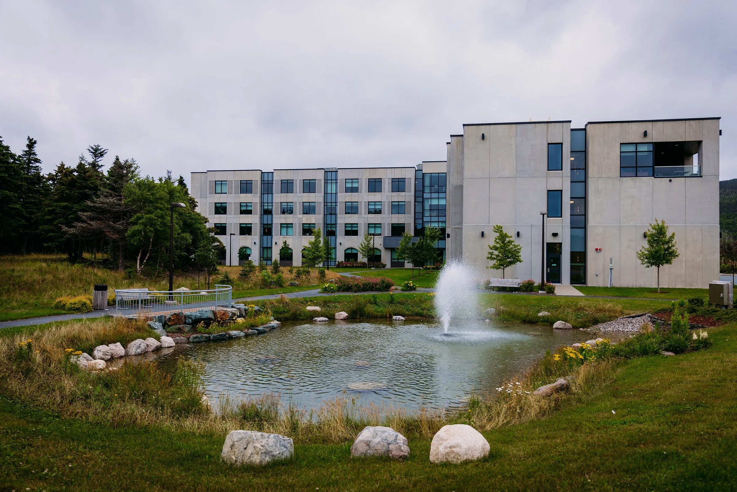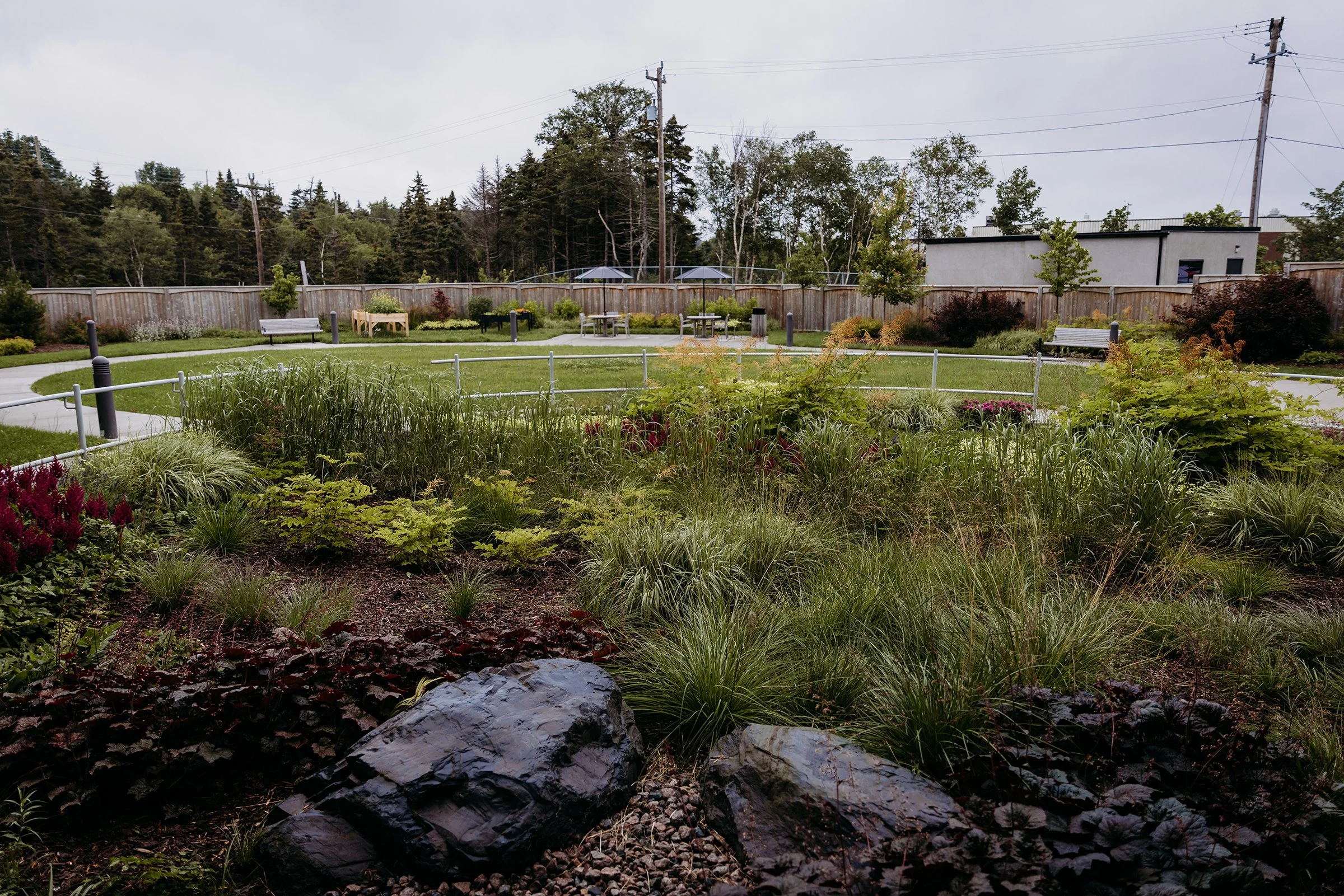 Mills & Wright was part of the multidisciplinary project team for this state-of-the-art assisted and independent living facility. The design provides a warm, welcoming feeling more akin to a home than an institution. The parklike setting and variety of comfortable outdoor spaces convey a message of care, health, and well-being for residents, staff and visitors and capitalize on existing site features such as mature stands of vegetation, comfortable southern exposure, and views of the scenic Waterford Valley. Landscape amenities provide accessible and inclusive opportunities for physical and social interaction, and are designed to appeal to a variety of ages, abilities, and levels of care. This includes an entry garden, woodland trail, a pond and fountain, as well as a therapeutic strolling garden. The lush gardens are designed to reflect a traditional Newfoundland garden, complete with nostalgic plant and landscape materials, to provide visual interest and act as a memory trigger for residents, invoking positive memories of their former homes.