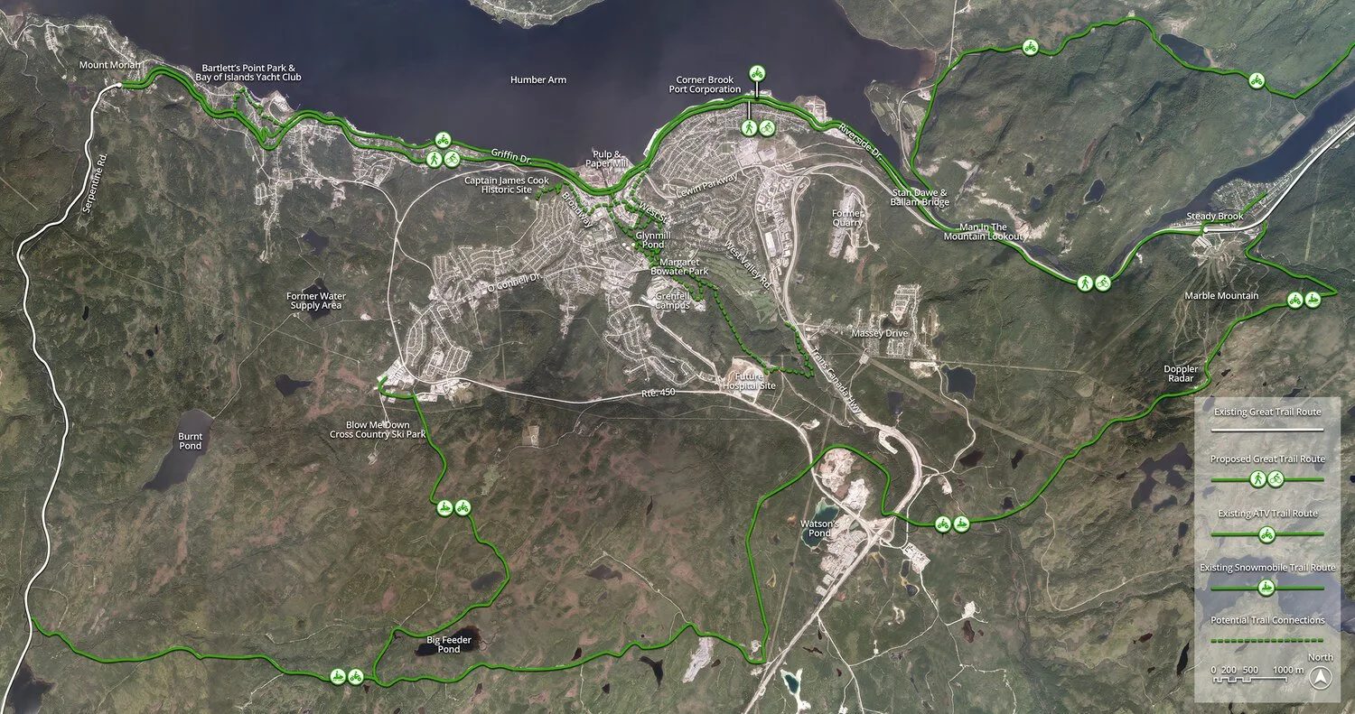 The Great Trail, formerly the Trans Canada Trail, is an incredibly ambitious trail project that aims to connect the country through over 24,000-kilometres of multiuse trail. Representing the largest recreational trail in the world, it aims to deliver a safe, enjoyable, high-quality trail that provides access to landscapes, history, and culture that are as vast and diverse as the country itself. The City recognized the current Great Trail within Corner Brook felt confusing, dangerous in places, and somewhat haphazardly planned. Working with Mills & Wright, the City initiated a feasibility study. Guided by extensive public engagement (six open houses in total), five alternate routes were selected and evaluated with the objective of finding one that provided the authentic, world-class experience that The Great Trail envisioned.